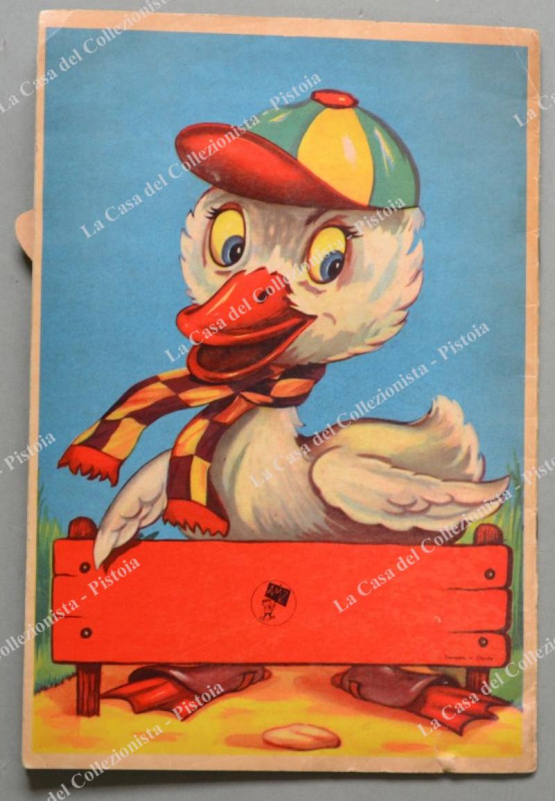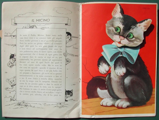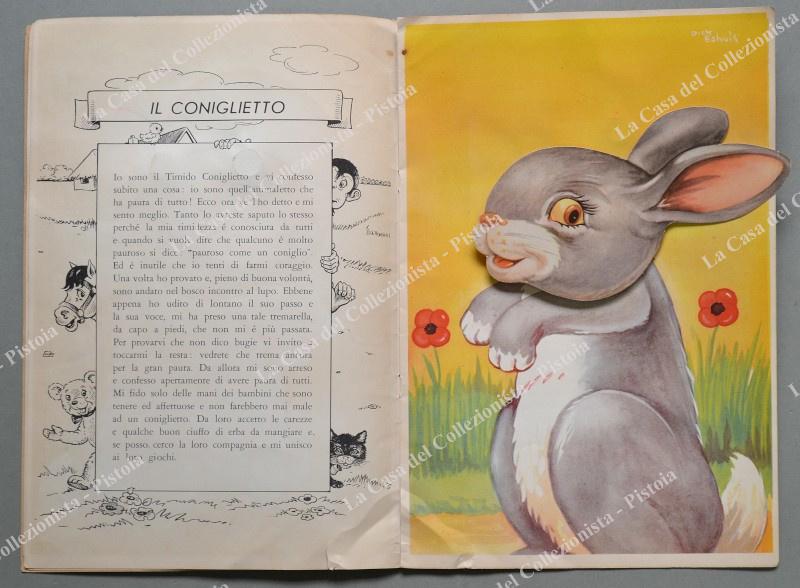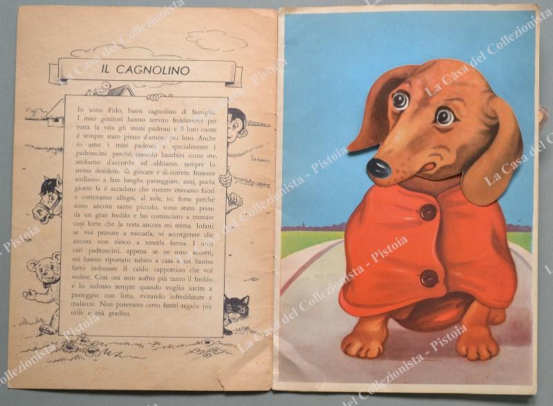 LIBRO PER BAMBINI. "I nostri cari amici". A colori e databile negli anni '50. Misura cm 21x31 e a ogni pagina di testo corrisponde a fronte una pagina disegnata a colori raffigurante un animale (un cane, un pulcino, un coniglio, un gatto, un agnello, un gallo) la cui testa è mobile essendo unita con una molla. A parte uno strappetto alla base di ogni pagina la conservazione è buona. (Rif.A7639-135/46)