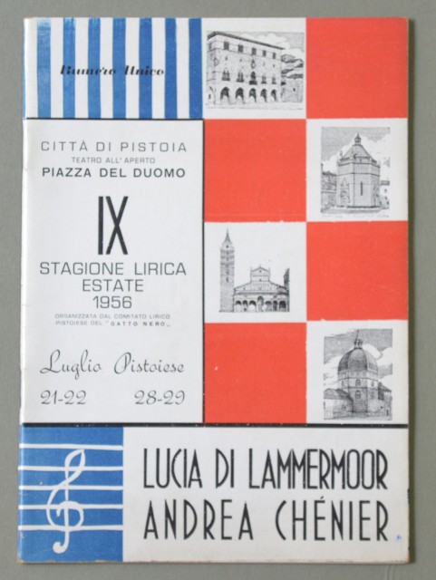 LIRICA, PISTOIA. Città di Pistoia, 9° Stagione Lirica, anno 1956. Lucia di Lammermoor e Andrea Chènier. Numero Unico illustrato di pagine 32, formato cm 17x14,5. Ottima conservazione. (Rif.C8336)