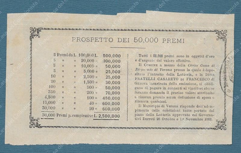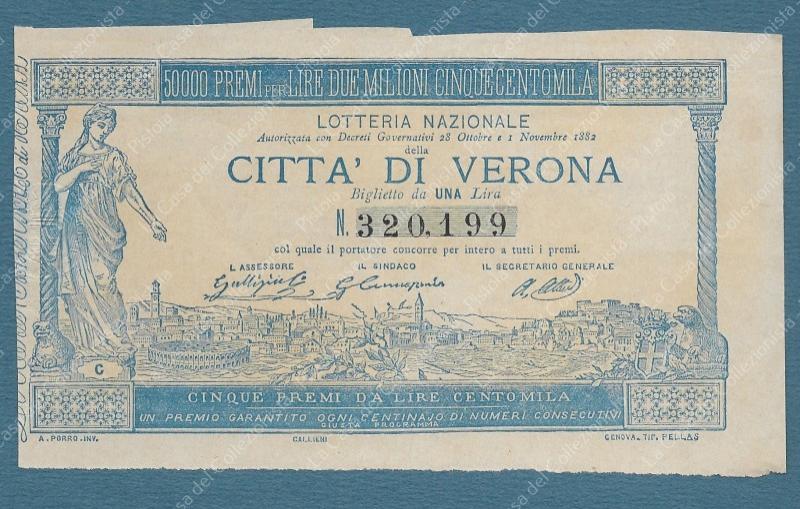 LOTTERIA CITTA' DI VERONA 1882. Biglietto da UNA lira