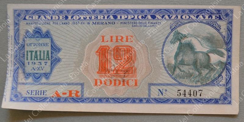 LOTTERIA DI MERANO 1937. Biglietto da lire 12. Ottima conservazione. (Rif.F6003)