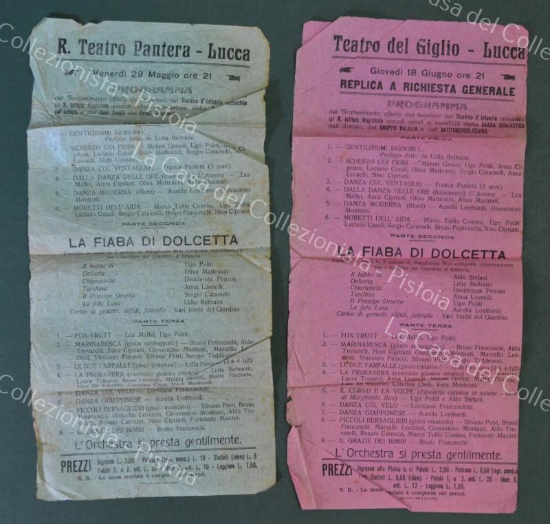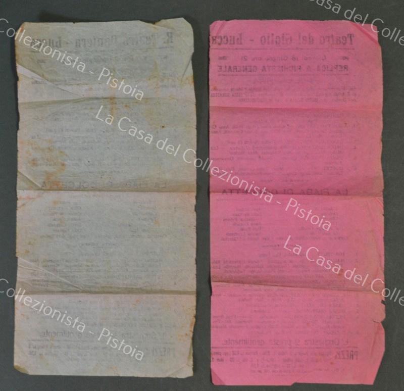 LUCCA. Teatro del Giglio - Teatro della Pantera. 2 volantini di cm 16x32, anni 1930. Pieghe. (Rif.F3819)