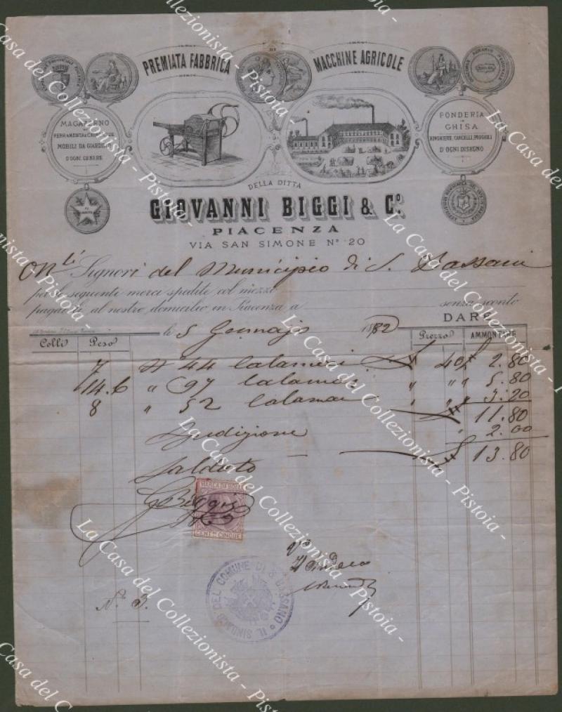 MACCHINE AGRICOLE BIGGI PICENZA. Vecchia fattura anno 1882