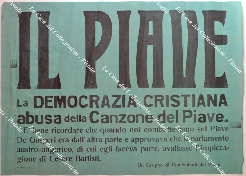 MANIFESTO POLITICO (circa 1953) contro la Democrazia Cristiana; stampato a cura di un Gruppo di Combattenti del Piave: "LA DEMOCRAZIA CRISTIANA ABUSA DELLA CANZONE DEL PIAVE ...". Cm 70x50. Conservazione buona eccetto minime imperfezioni. (Rif.F6628)