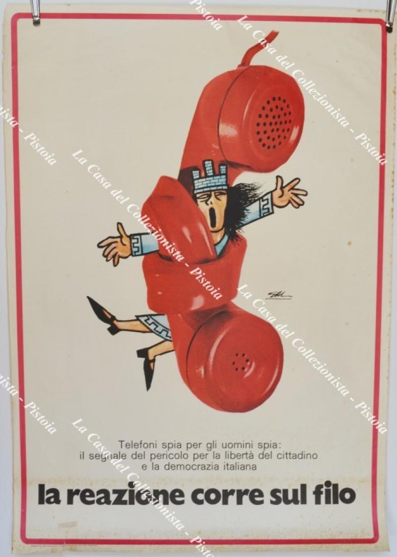 MANIFESTO Politico disegnato da GAL (Gino Galli). LA REAZIONE CORRE SUL FILO. A cura del Partito Comunista Italino, anni ‘70. Cm 70x100. Alcuni ingiallimenti, strappetti e alone al margine inferiore. (Rif.F6209-76)