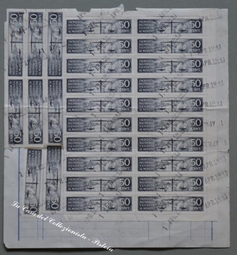 MARCHE DA BOLLO. Conteggio del 1941 con applicate a retro 28 pezzi da cent. 50 grigio. Una marca è stata spillata, qualche imperfezione. (Rif.D2671)