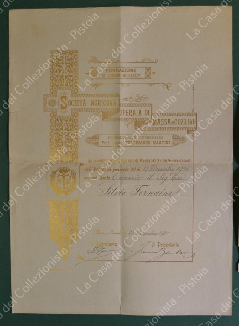 MASSA e COZZILE, Pistoia. SOCIETA' OPERAIA. Diploma con nomina di socio del 1905