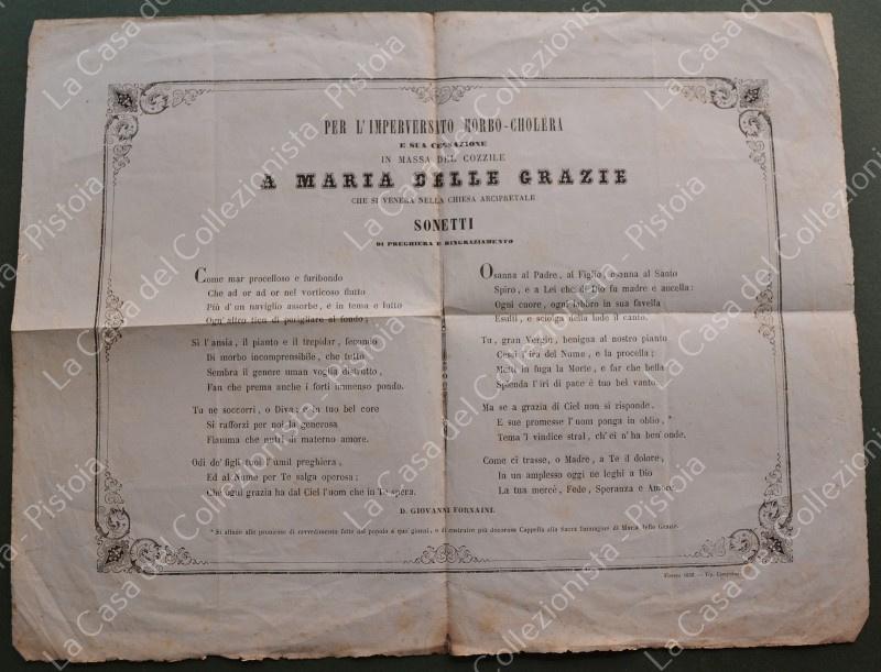 MASSA e COZZILE, Pistoia. Sonetto in ringraziamento per la fine dell'epidemia di colera. Firenze, anno 1856. Cm 35x28. Pieghe da conservazione e lievi imperfezioni. (Rif.F7790)