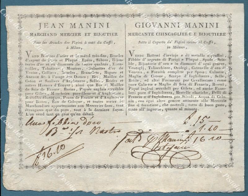 MILANO, inizio '800. Raro documento di un mercante di chincaglierie e bijouterie. Sotto il Coperto de' Figini vicino al Caffè in Milano.