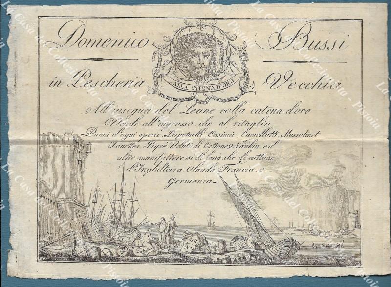 MILANO, Un antico venditore di stoffe. DOMENICO BUSSI in PESCHERIA VECCHIA. All'insegna del Leone colla catena d'oro. Vende all'ingrosso che al ritaglio Panni di ogni specie, Perpetuelli, Camellotti, Mussolinet, ecc.. Foglio di cm 21x15 con incisione all'acquaforte. Al retro conto e firma per ricevuta datata 1805 del commerciante Domenico Bussi. PORTA DI PESCHERIA VECCHIA - Milano. La Porta di Pescheria o di Sant'Ambrogio era ilvoltone che comunicava col Sestiere di Porta Orientale (oggi Porta Venezia), si chiamava così perchè si trovava in corrispondenza della Contrada di Pescheria Vecchia. (Rif.F5413)