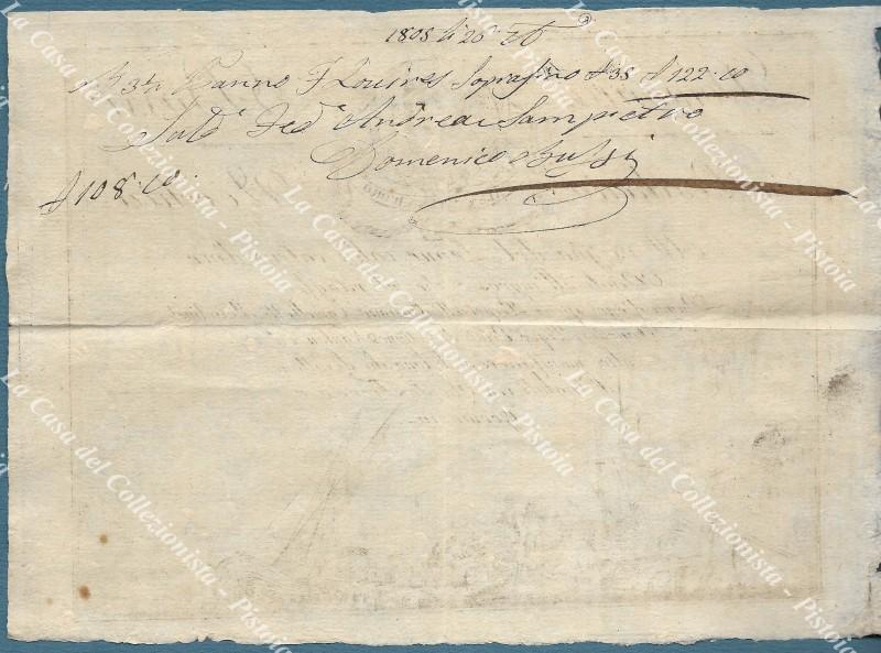 MILANO, Un antico venditore di stoffe. DOMENICO BUSSI in PESCHERIA VECCHIA. All'insegna del Leone colla catena d'oro. Vende all'ingrosso che al ritaglio Panni di ogni specie, Perpetuelli, Camellotti, Mussolinet, ecc.. Foglio di cm 21x15 con incisione all'acquaforte. Al retro conto e firma per ricevuta datata 1805 del commerciante Domenico Bussi. PORTA DI PESCHERIA VECCHIA - Milano.