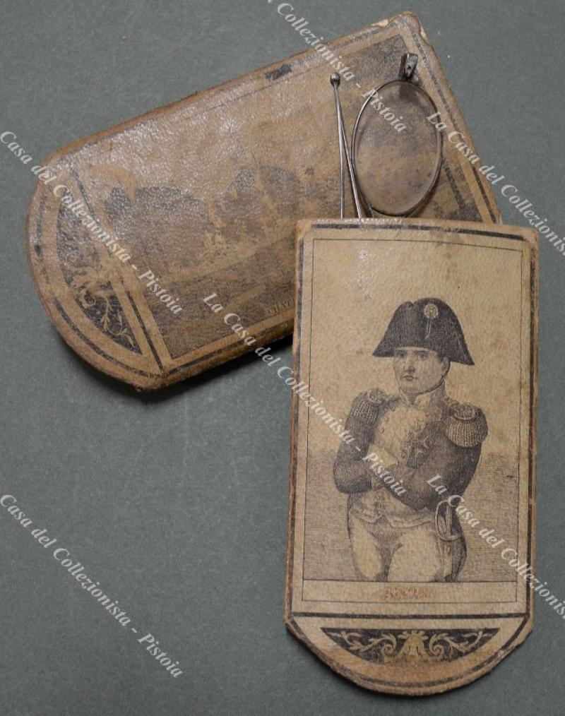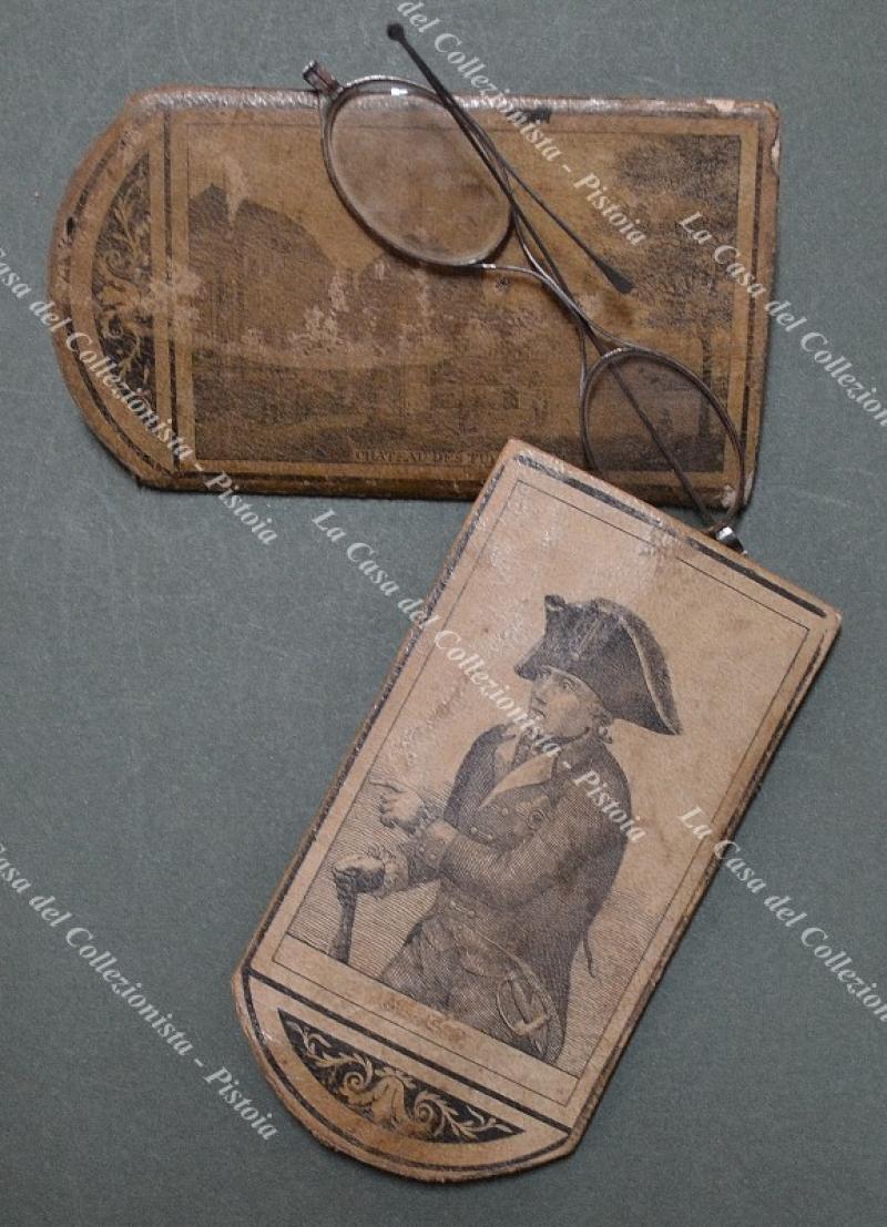 Napoleone, antico astuccio porta occhiali composto da due parti recanti sui lati incisioni di Napoleone e castelli francesi. Realizzato in carta (abrasioni e piccola mancanza di carta su un lato), misura cm 14x7 (chiuso). Databile nella prima metà '800. Contiene occhiali a cui manca una stanghetta. (Rif.F6958)