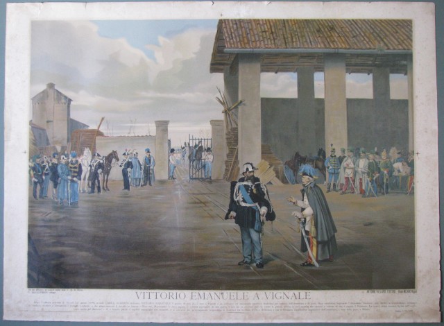 OLEOGRAFIA a colori di grandi dimensioni (mm 740x550 ai margini) raffigurante l'incontro al cascinale di Vignale tra V. Emanuele ed il maresciallo Radetzky. Grande animazione. Vallardi, fine '800. Buona conservazione eccetto normali bruniture della carta e qualche strappetto sui bordi bianchi. (Rif.B4871-52/52)
