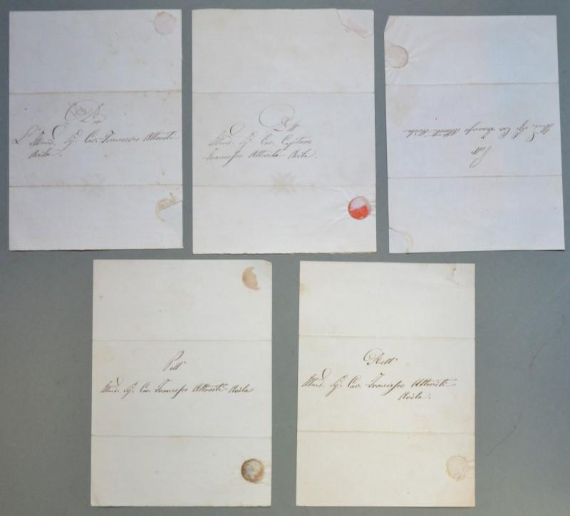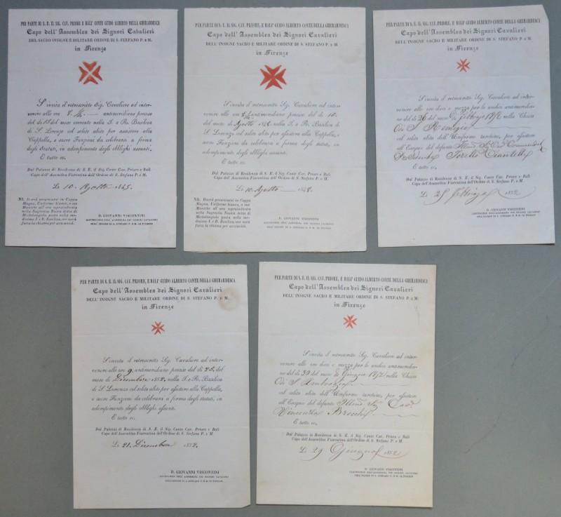 ORDINE DI SANTO STEFANO. 5 lettere (a stampa e compilate a mano) inviate tra il 1848 e il 1852. Tutte contengono invito a intervenire in abito da cerimonia. Quattro bifoli di cm 15x21. Ottima conservazione. (Rif.D4203)