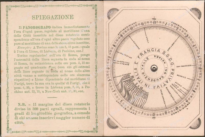 PANOGRAFO ossia l'ora d’ogni Paese. Cartoncino di cm 8,5x11 (aperto cm 17x11) con all'interno un disco mobile per conoscere l'ora in ogni paese. Inizio '900. (Rif.D6802-48/70)