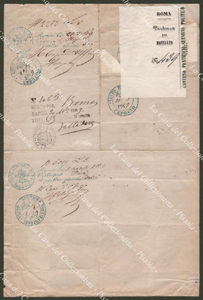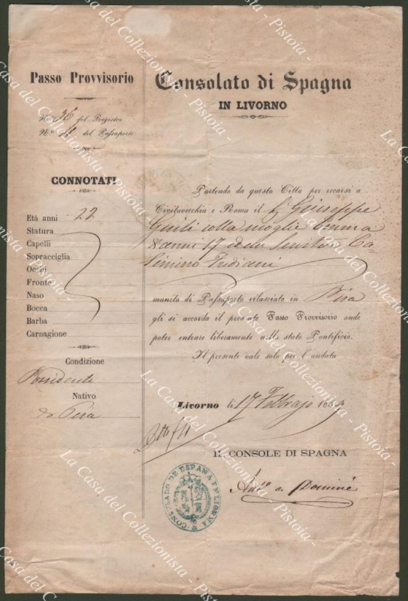 PASSAPORTO per lo Stato Pontificio rilasciato dal Consolato di Spagna in Livorno il 17.02.1869