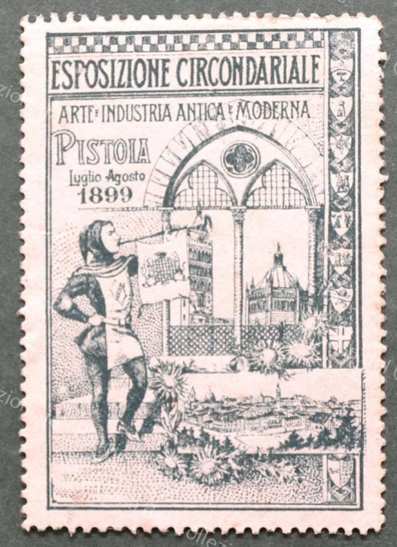 PISTOIA. Etichetta chiudilettera. Esposizione Circondariale Arte Antica e Moderna. Pistoia Luglio Agosto 1899. Mm 40x60. (Rif.F1502)