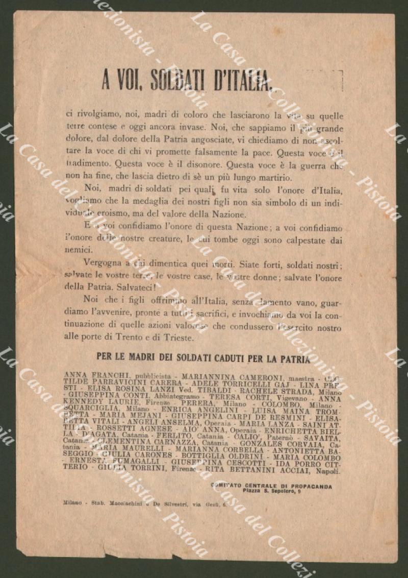 PRIMA GUERRA. A VOI SOLDADI D'ITALIA. Volantino di propaganda patriottica, circa anno 1917