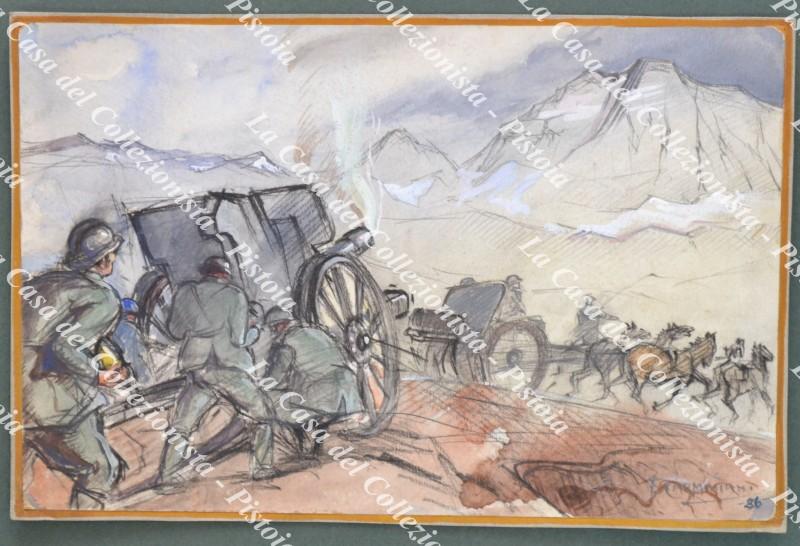 PRIMA GUERRA. Artiglieria da Campagna. Acquarello tempera e matita, firmato F. Carminiani. Foglio di cm 24,5x15,8 applicato su vecchio cartoncino, anni ’20. Ottima conservazione. (Rif.D9861-141/73)