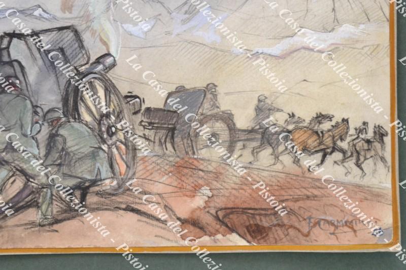 PRIMA GUERRA. Artiglieria da Campagna. Acquarello tempera e matita, firmato F. Carminiani. Anni ’20.