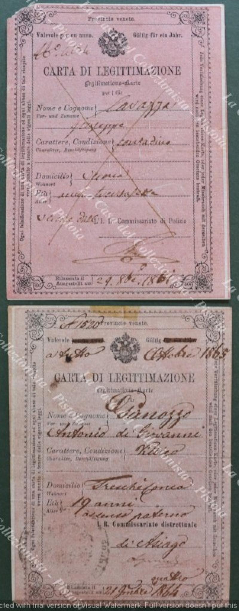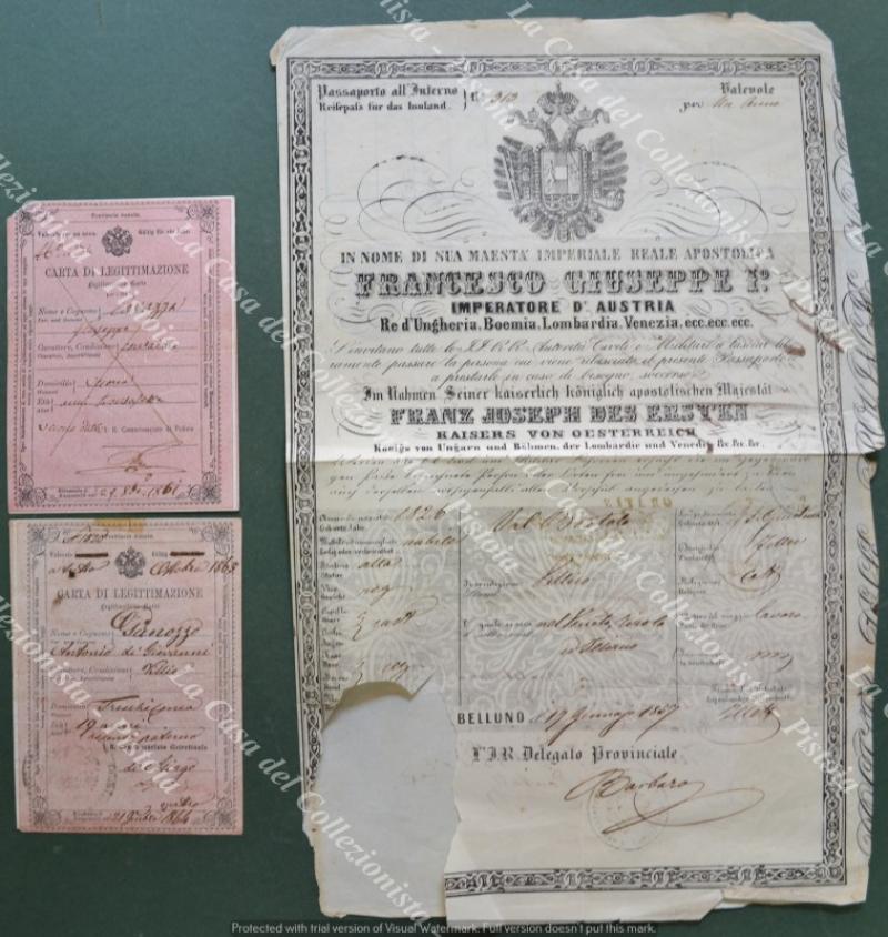 PROVINCE VENETE. 2 carte di legittimazione (1861 e 1864) + passaporto del 1857.