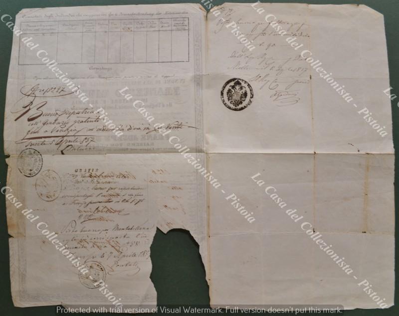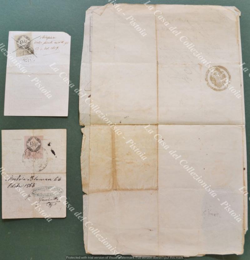 PROVINCE VENETE. 2 carte di legittimazione rilasciate nel 1861 e 1864; a retro marca da 15Kr. UNITO passaporto rilasciato in Belluno nel 1857 (quattro pagine con annotazioni e timbri); mancanza di carta all'angolo inferiore sinistro. (Rif.F5237)