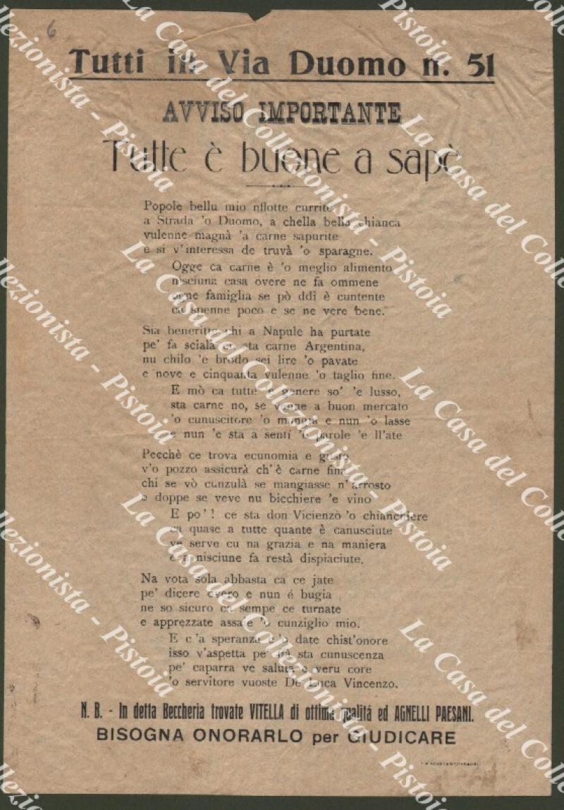 NAPOLI UNA MACELLERIA INIZIO 1900: “Tutti in Via Duomo n. 51. Avviso importante. Tutte e’ buone a sape’”. Foglio di cm 17x24,5 stampato a Napoli all’inizio1‘900. Contiene una poesia sulla bontà della carne venduta (vitella di ottima qualità e agnelli paesani). Buona conservazione eccetto piccole imperfezioni. (Rif.F0189-108/73)
