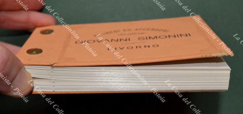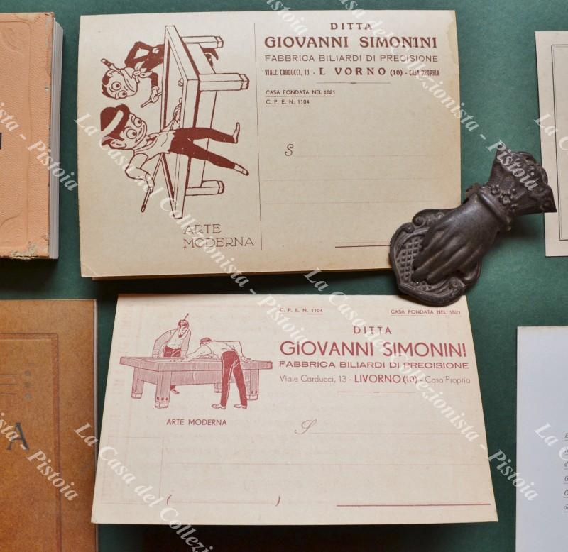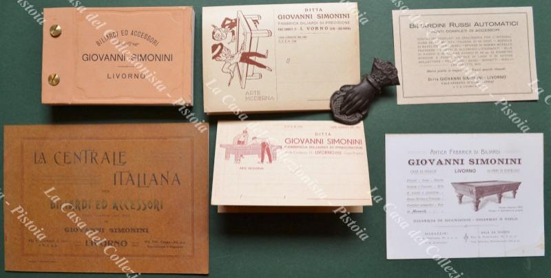 Pubblicità. BILIARDO. Fabbrica Giovanni Simonini di Livorno. Insieme del 1912 e composto da: 2 diverse cartoline doppie pubblicitarie, 1 depliant di 20 paginem illustrate, 1 blocchetto per appunti con viti e copertina intestata, 3 diversi cartoncini. (Rif.F4049)