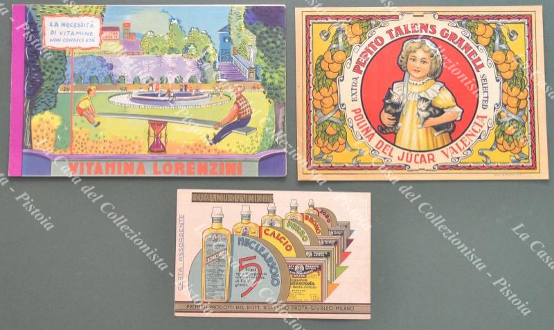 PUBBLICITA'. Un cartoncino a colori anno 1952 VITAMINA LORENZINI, cm 30x18,5**Una carta assorbente pubblicità ricostituente NUCLEARSOLO. Cm 21x13,7, (circa 1920)** Grossa etichetta policroma (inizio '900) pubblicità PEPITO TALENS GRANEL. Cm 27,3x19,2. Buona conservazione. (Rif.F1910)