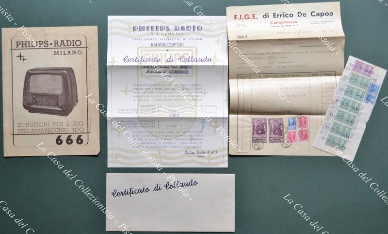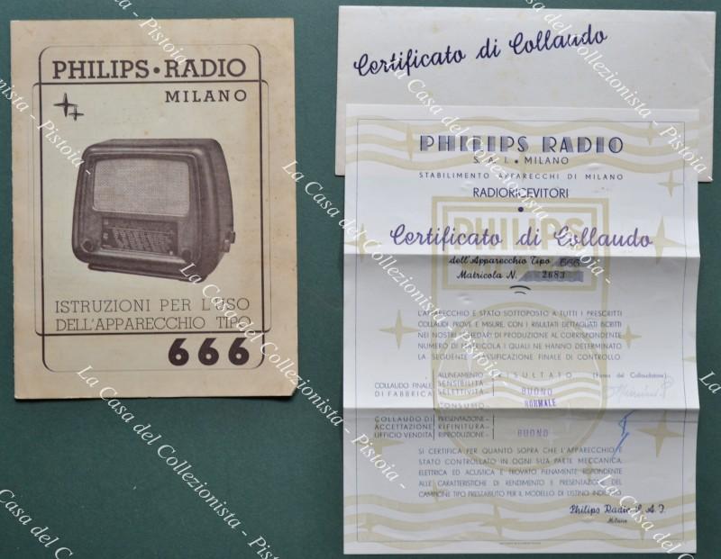 RADIO PHILIPS 666. Istruzioni per l'uso. Anno 1942. Quattro pagine di cm 17,5x23,5. Unito certificato di controllo dell'apparecchio, fattura d'acquisto e ricevuto di abbonamento. Ottima conservazione. (Rif.D7541)