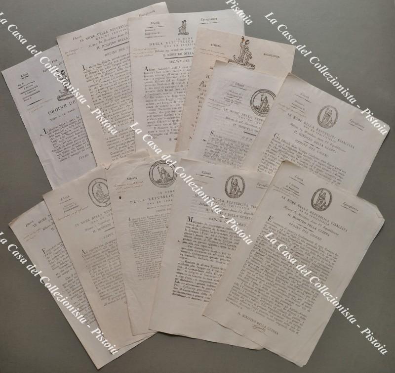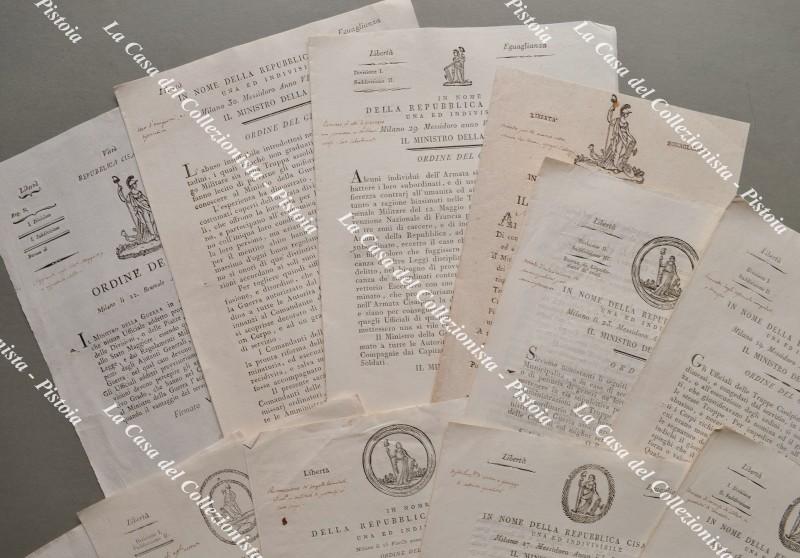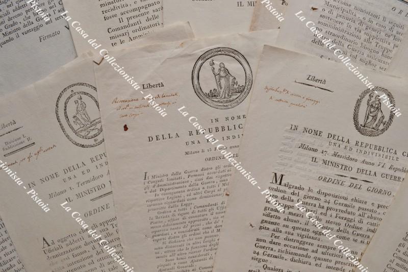 REPUBBLICA CISALPINA. Dominazione francese. Insieme di 11 ordini del giorno dati dal ministro della guerra in Milano l'anno VI repubblicano (1798).