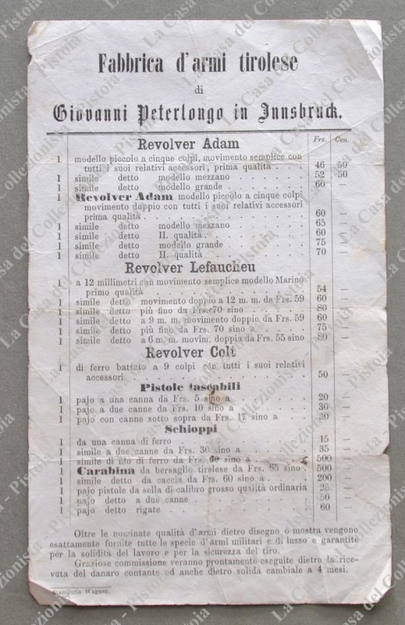REVOLVERS, PISTOLE, SCHIOPPI. Listino prezzi. Fabbrica di armi di Giovanni Peterlongo in Innsbruck. Fine 1800, cm 13x20. (Rif.D5823)