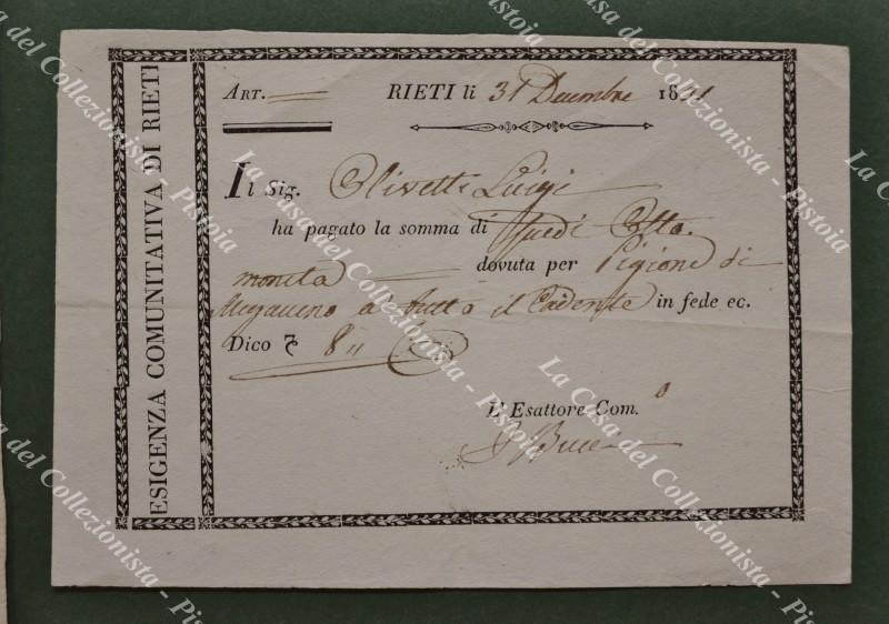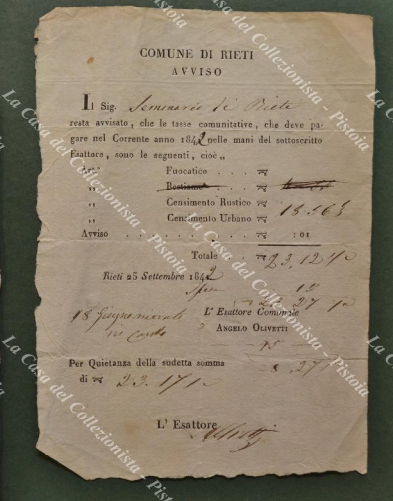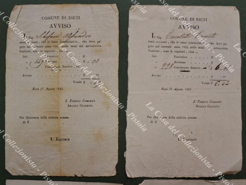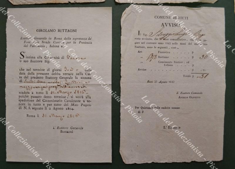 RIETI, Governo Pontificio. Insieme formato da 4 avvisi, una ricevuta ed una intimazione. Anni 1816 - 1842. Ottima conservazione. (Rif.F5026)