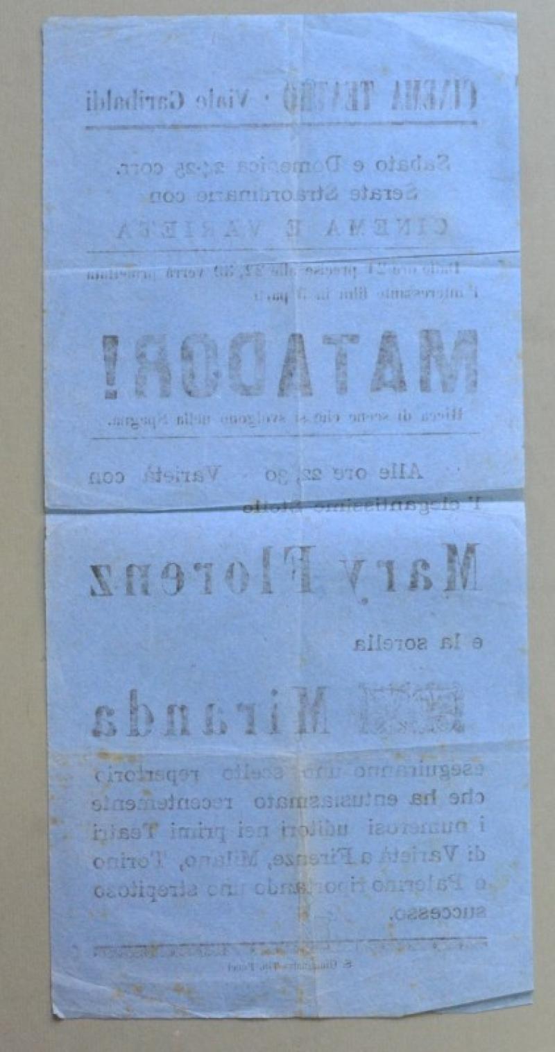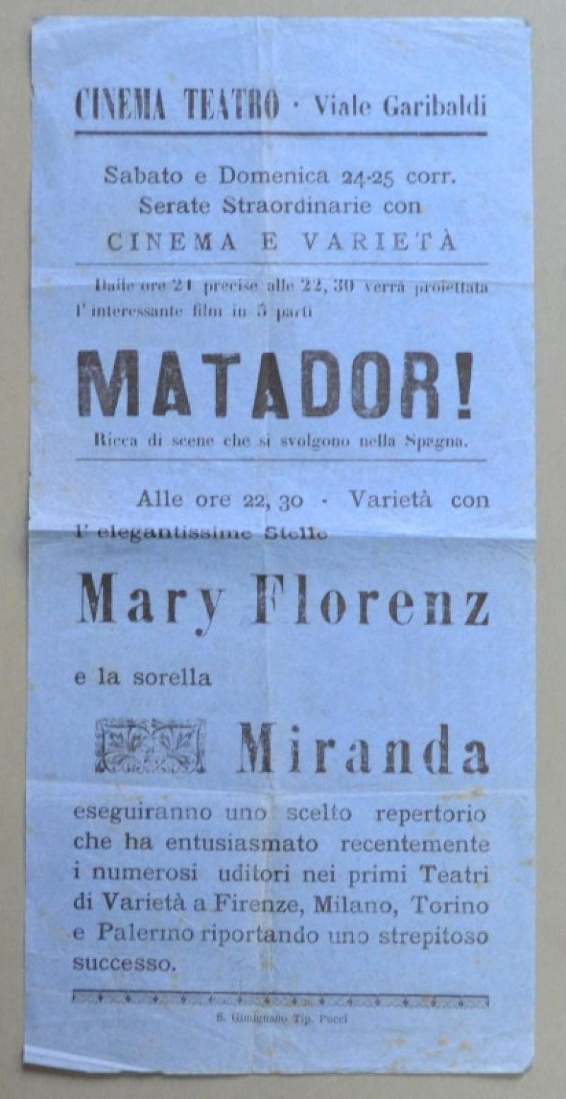 S. GIMIGNANO, Siena. CINEMA TEATRO VIA GARIBALDI. Volantino originale pubblicitario (circa 1925)