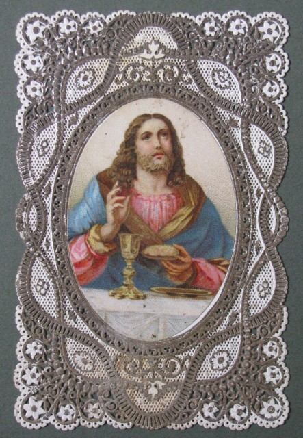 SANTINO di cm 6x9 databile alla fine del 1800. Immagine di Cristo contornata da carta traforata. Molto bello ed in ottima conservazione. (Rif.A7106-84/51)