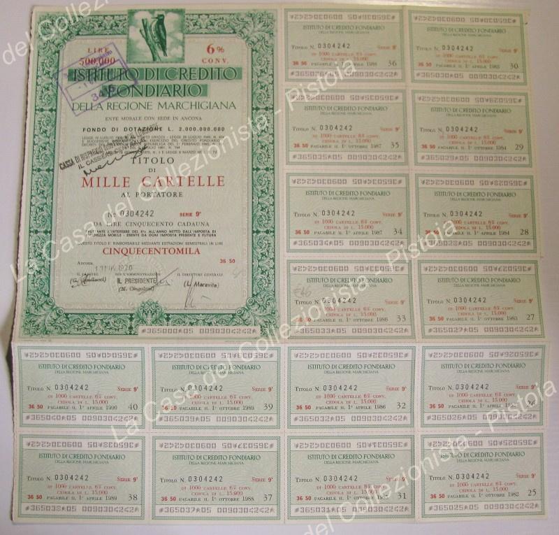 SCRIPOFILIA. MILLE CARTELLE al portatore da lire 500. Istituto di Credito Fondiario della Regione Marchigiana. Ancona, 13.11.1970. Cm 33x22 più cedole. (Rif.E4239)