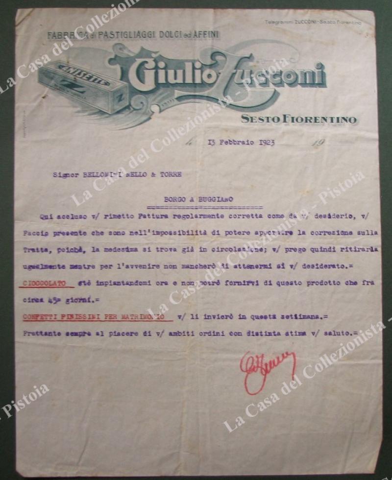 SESTO FIORENTINO. Vecchia fattura 1923 fabbrica pastiglie dolci Giulio Zucconi