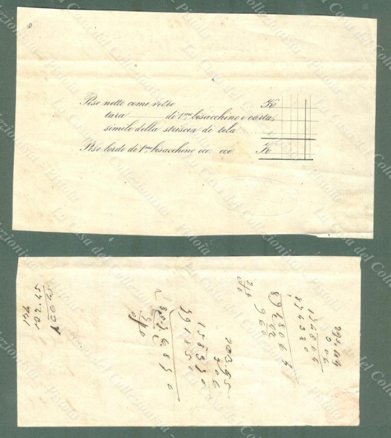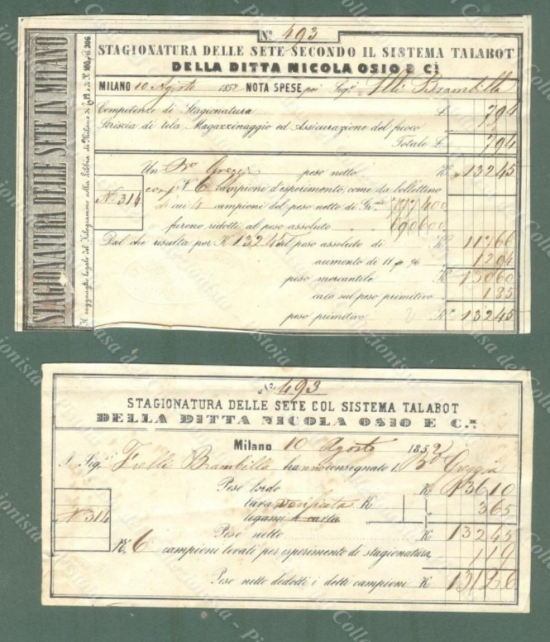 SETA. 2 ricevute del 1852 della ditta Osio di Milano per "stagionatura della seta". Cm 15x7 e cm 15,5x9,5. Ottima conservazione. (Rif.E5972)
