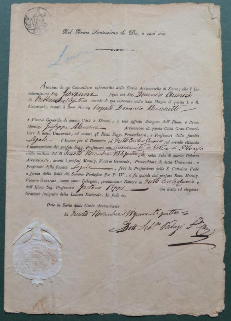 Siena, anno 1844. LAUREA IN DIRITTO CIVILE E CANONICO.