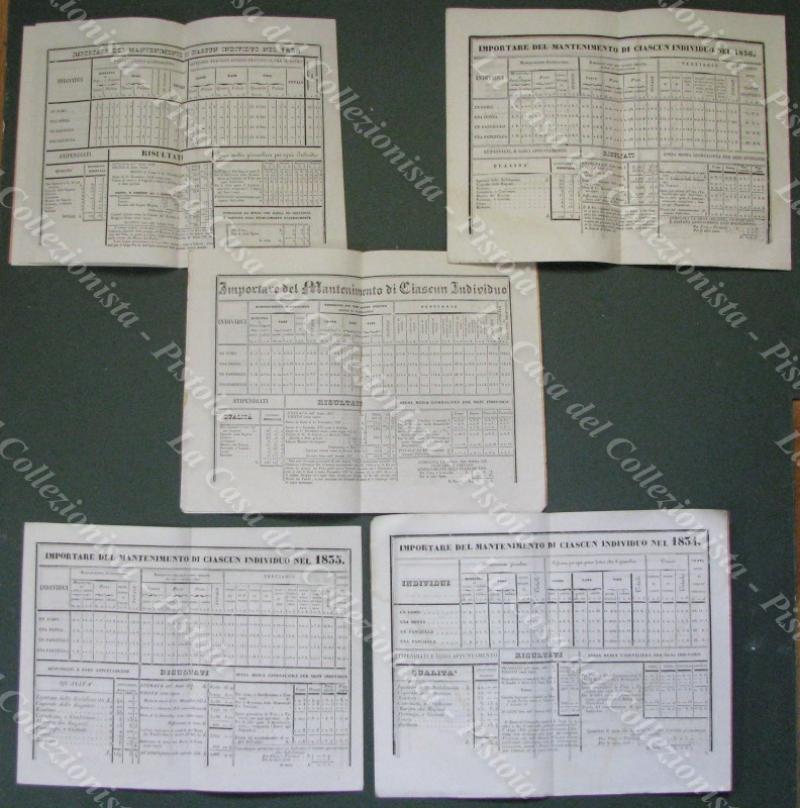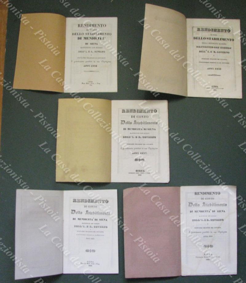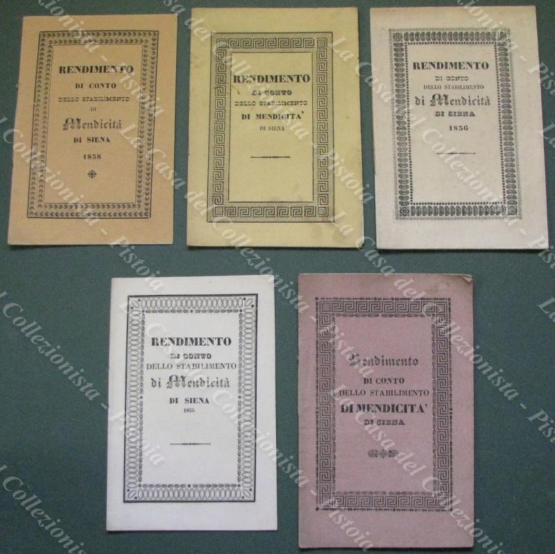 SIENA. STABILIMENTO DI MENDICITA'. 5 opuscoli con i rendiconti per gli anni 1834/1838. Cm 14x20, brossure tipografiche. (Rif.E5689)