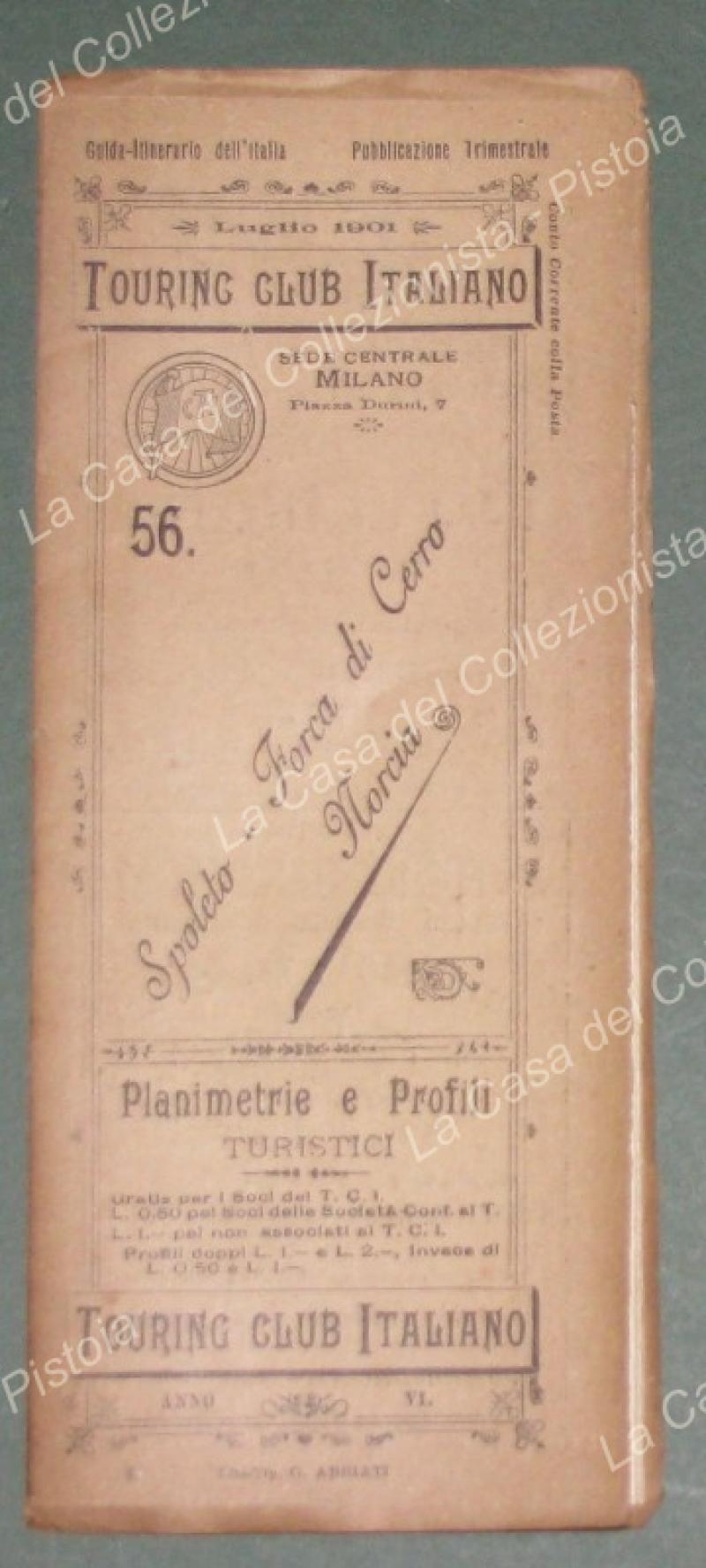 SPOLETO-FORCA DI CERRO-NORCIA. Planimetria e profilo ciclistico. Anno 1901. Graziosa cartina edita dal Touring Club Ciclistico Italiano contenuta in brossura editoriale e piegata a fisarmonica. MM 940x210. Nella prima parte l'altimetria del percorso con note sulla pendenza e lo stato delle strade; nella seconda parte la certina topografica della zona. Aperta la cartina misura cm 72x21,5. (Rif.E4219)