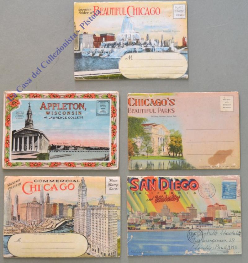 STATI UNITI: CHICAGO, SAN DIEGO APPLETON. 5 buste policrome da spedire, contenenti, unite a fisarmonica, 18/20 immagini. Anni '50. Qualche piccola imperfezione. (Rif.D5788)