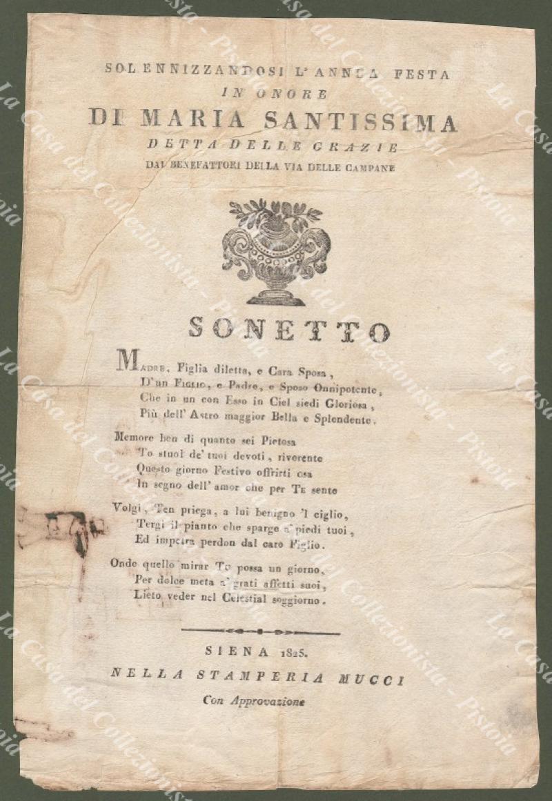 (Toscana-Siena). SOLENNIZANDOSI L'ANNUA FESTA IN ONORE DI MARIA SANTISSIMA DETTA DELLE GRAZIE DAI BENEFATTORI DELLA VIA DELLE CAMPANE. SONETTO. Siena, stamperia Mucci, 1825. Cm 21x31, qualche difetto. (Rif.F2066)