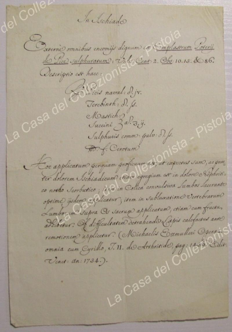 UN RIMEDIO DEL 700 per la sciatica e il male di schiena. Ricetta per un impiastro a base di pece solforata; scritta in latino e datata 1734. Foglio di cm 15x21. Ottima conservazione. (Rif.E4174)