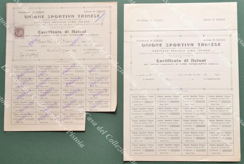 UNIONE SPORTIVA TRINESE di Trino Vercellese. 2 certificati per azioni da lire 50 ciascuna; uno in bianco. Anno 1922. Cm 24x28 e cm 24x35. Ottima conservazione. (Rif.F1512)