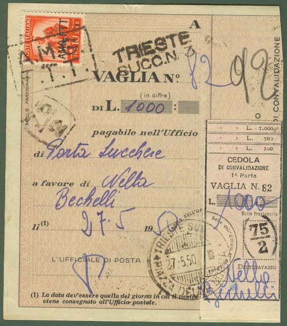 Italia Trieste A. Sezione di modulo vaglia del 27.5.1950