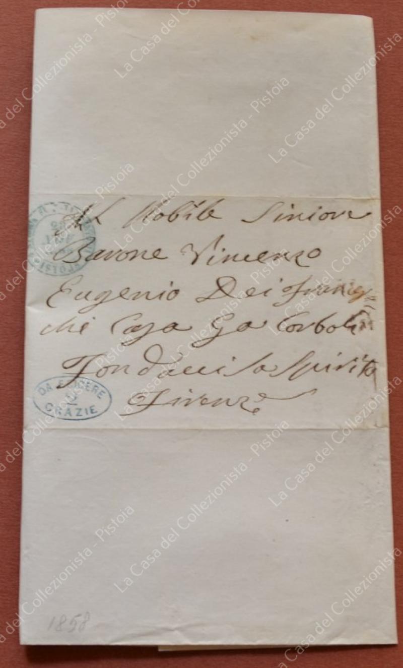 Antichi Stati. STRADE FERRATE MARIA ANTONIA. Lettera completa del testo del 1858 da Pistoia a Firenze. Bolli in azzurro. (Rif.F6460)