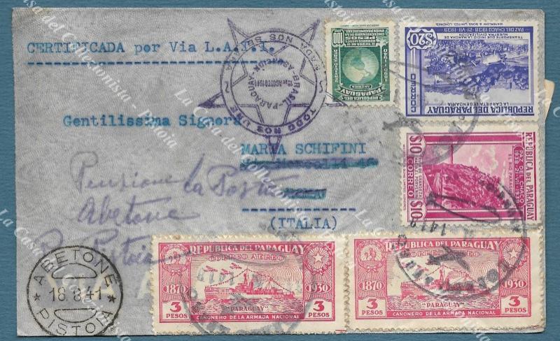 PARAGUAY. Aerogramma. Raccomandata del 1941 via L.A.T.I. (Linee Aeree Transcontinentali Italiane). Per Roma e rispedito ad Abetone (Pistoia). Ottima qualità. Francobolli ben dentellati. (Rif.F3427)