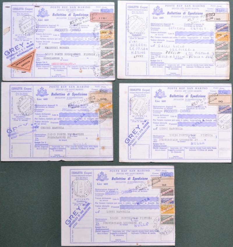 SAN MARINO. PACCHI 1948-50. Cinque bollettini di spedizione usati nel 1972.