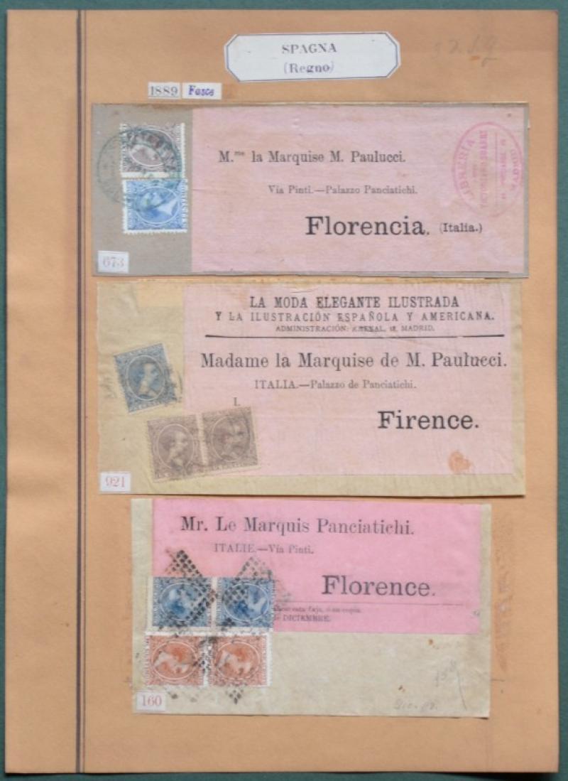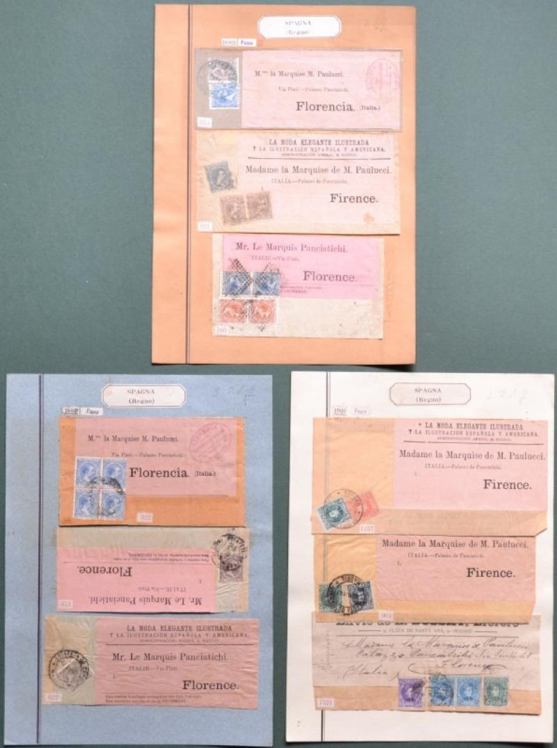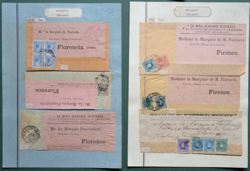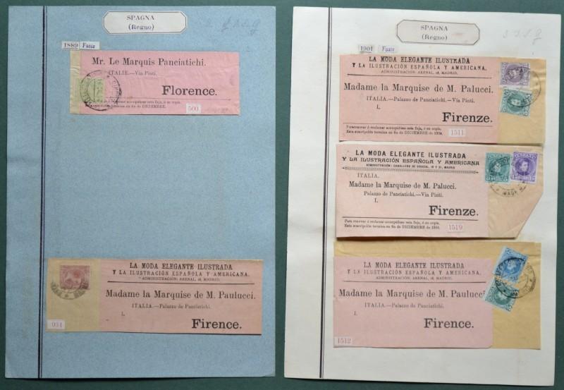 SPAGNA. FASCETTE PER GIORNALI. 14 parti anteriori di fascette per giornali e riviste del 1889-1901 dirette da Madrid a Firenze. Montate all'epoca su fogli di cartoncino. (Rif.D7539)