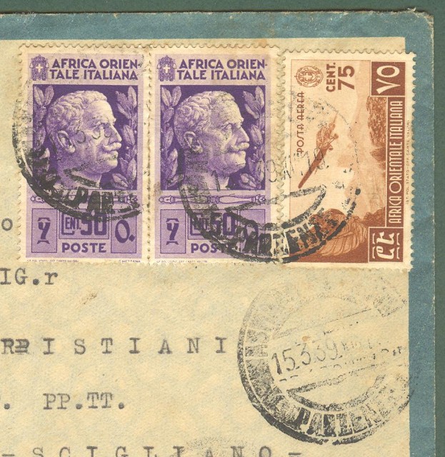 Storia postale Colonie. AFRICA ORIENTALE ITALIANA. Aerogramma del 15.3.1939 da Asmara per Scigliano (Cosenza). Affrancato con cent. 75 bruno Posta Aerea (Sassone A 4) + due pezzi cent. 50 violetto Augusto. Francobolli ben dentellati. Ottima qualità . (Rif.c9105)